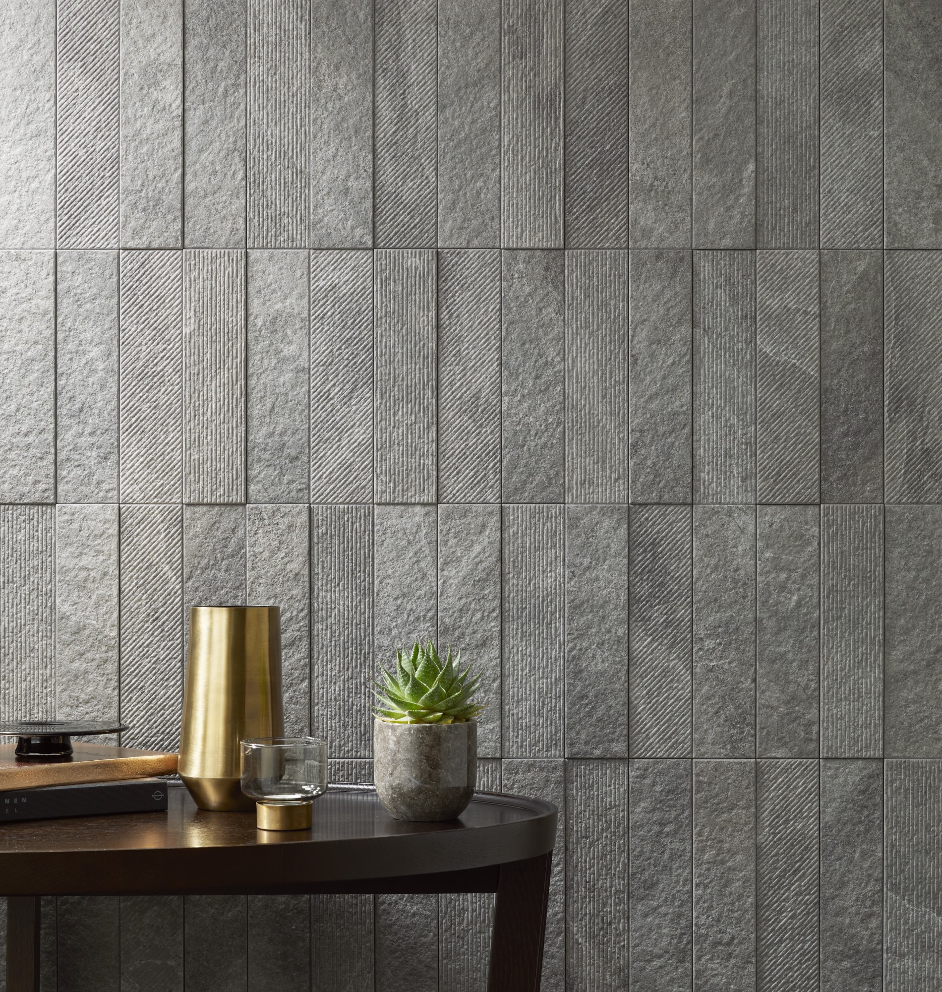 空間に自然の豊かさを添える、力強いスレートの質感を表現。