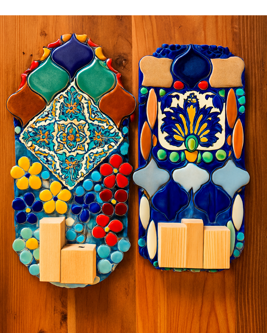 アフリカ大陸のチュニジアから届いた手書きの素朴な、そして色彩豊かなタイルをメインに使用します。
