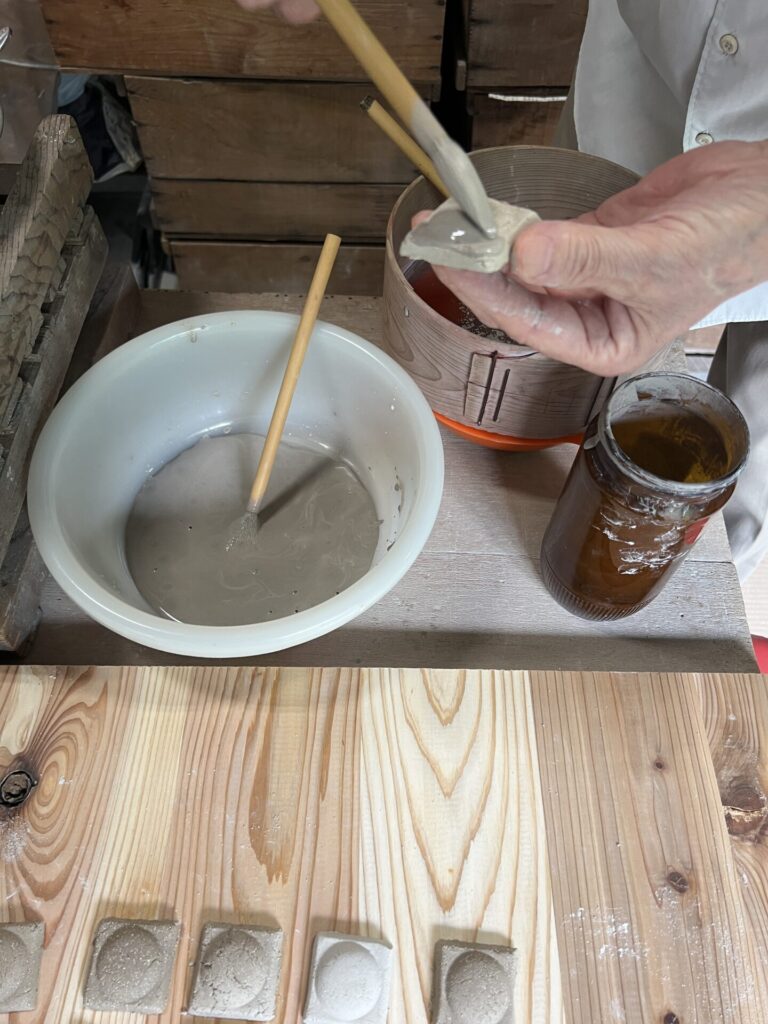 まずは手起こしの素地を前に、先生が静かに釉を撹拌する。器の内側で渦が立ち、粘度が目でわかるほどに整っていく