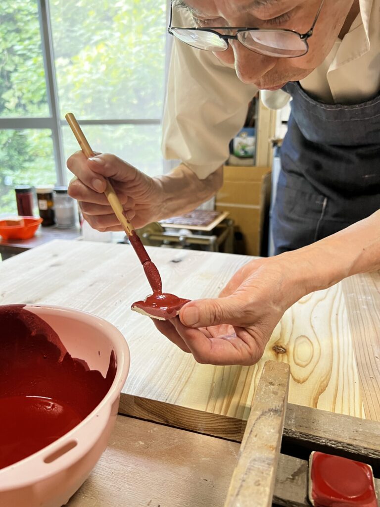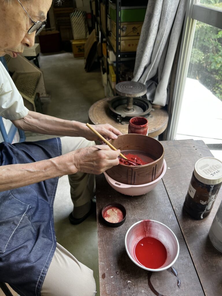 夏の終わり、蝉の声が遠くで続く工房で、泰山の“命”ともいえる釉薬置きの手ほどきを受けました。色にはそれぞれ名前があり、筆の角度と厚み、待つ時間がその名を呼び起こします。