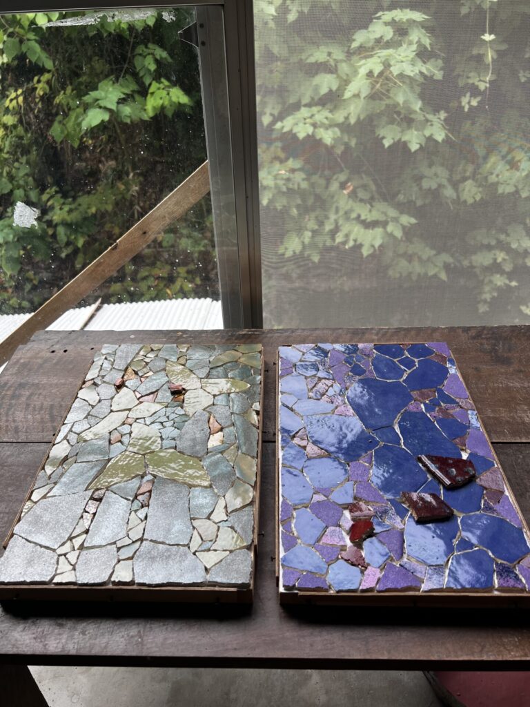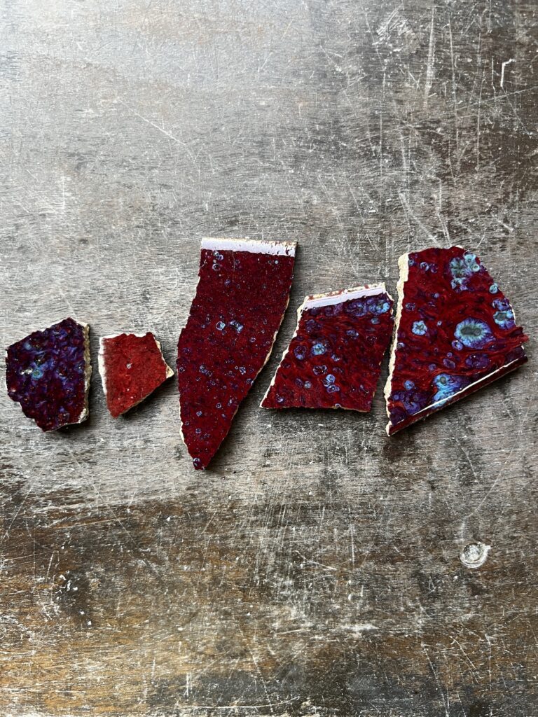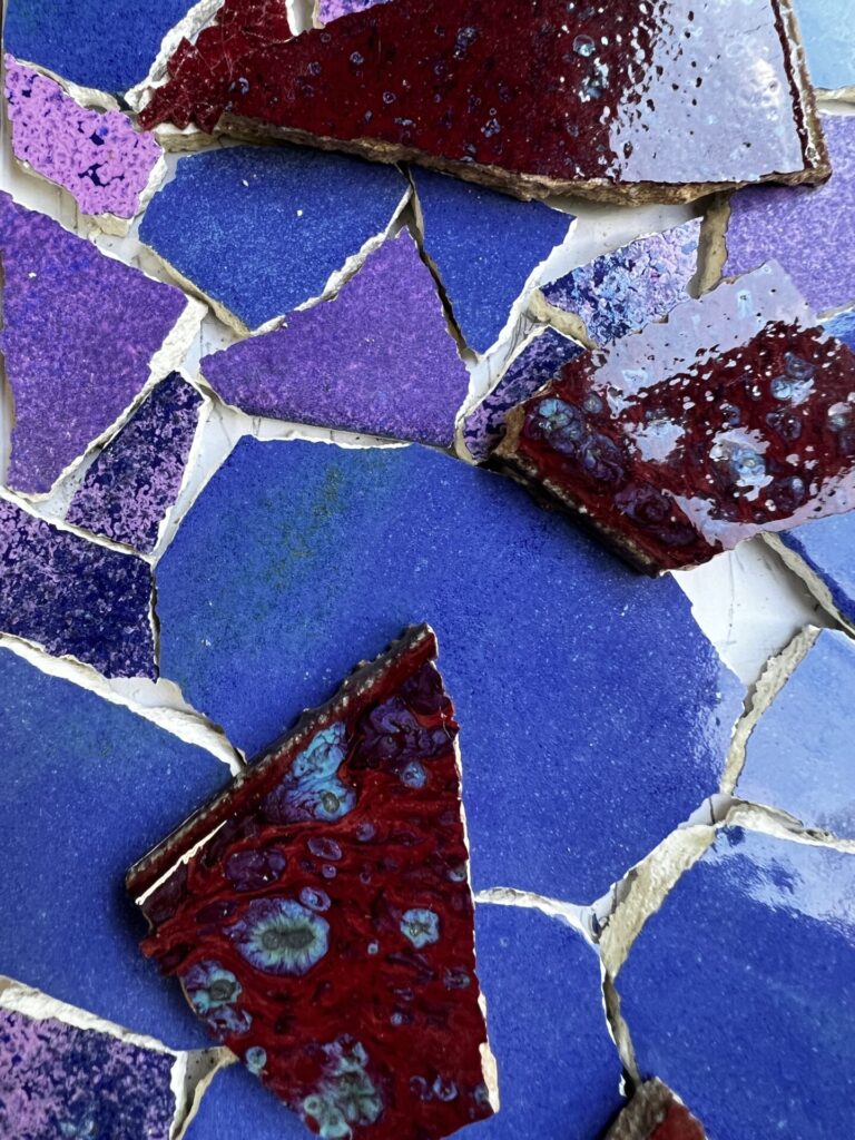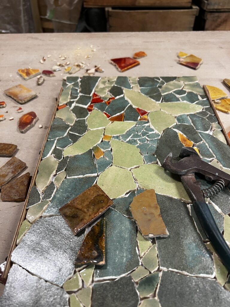 ひとつひとつの破片に触れながら、色を選び、置き方を試し、釉薬の表情を見つめていく。