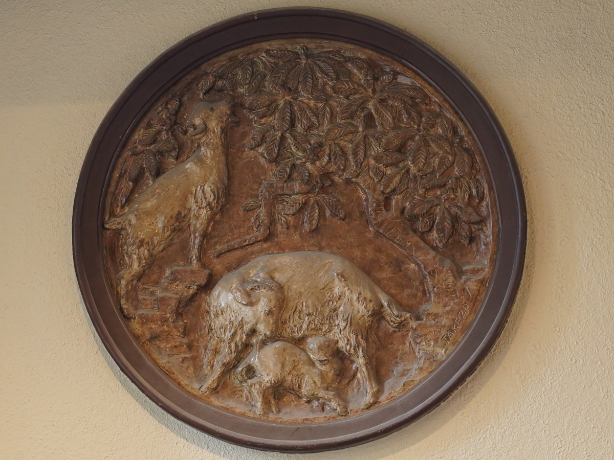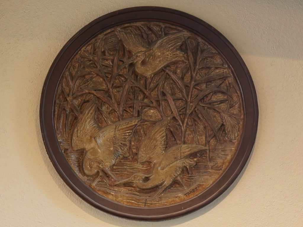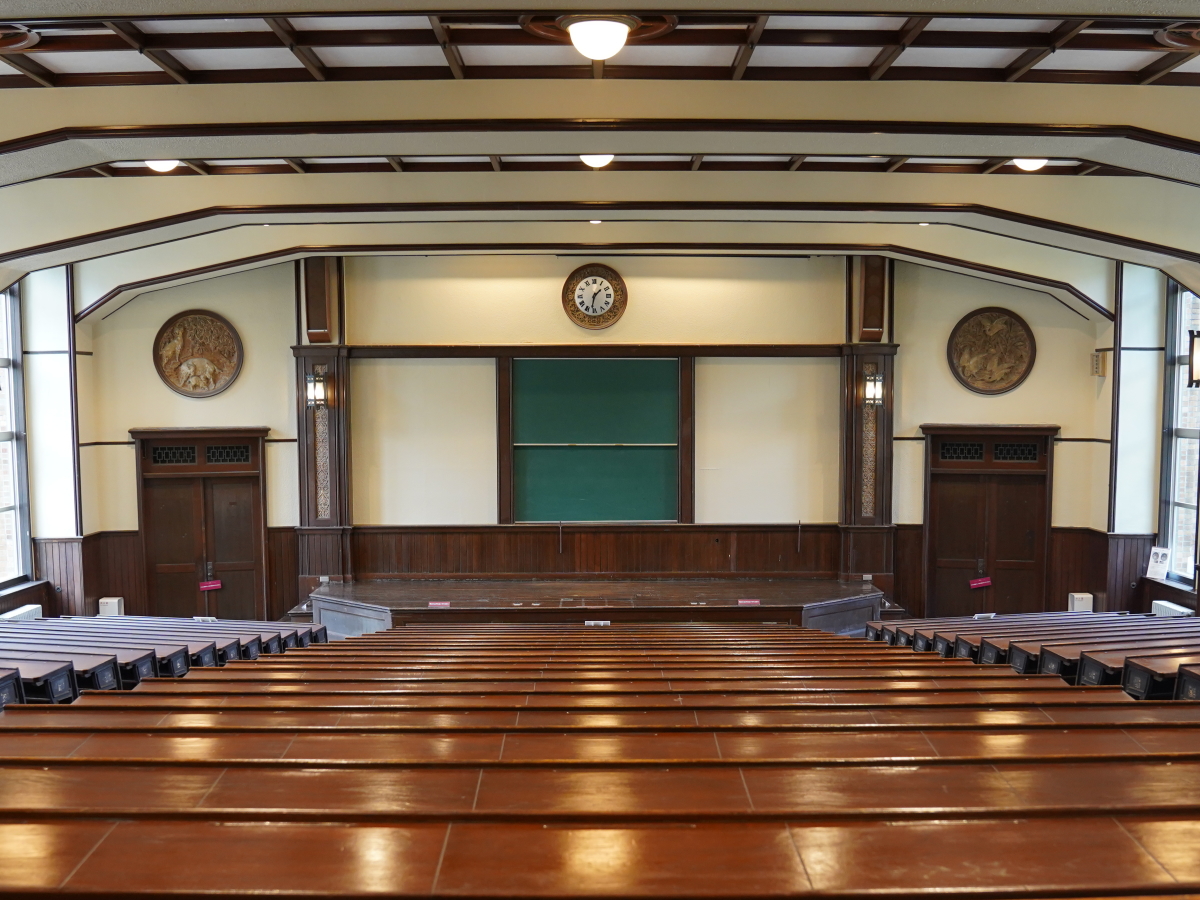 4階旧講堂の前面に二つの大型レリーフ陶板が設置されている。新海竹蔵が制作し、泰山製陶所が焼成したもの。東京大学図書館に設置されているものと同時期に制作された。