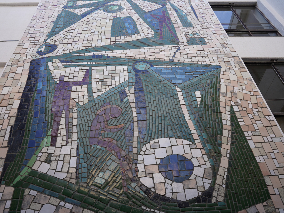 愛知県蒲郡市役所庁舎、中庭壁面に設置されている壁画。圧巻の大きさ。蒲郡の産業である「機織り」をデザインしている。見学は庁舎開館日のみ。中庭に勝手に出ることは出来ない為、受付にて中庭のタイル壁画を見たい旨を申し出て下さい。