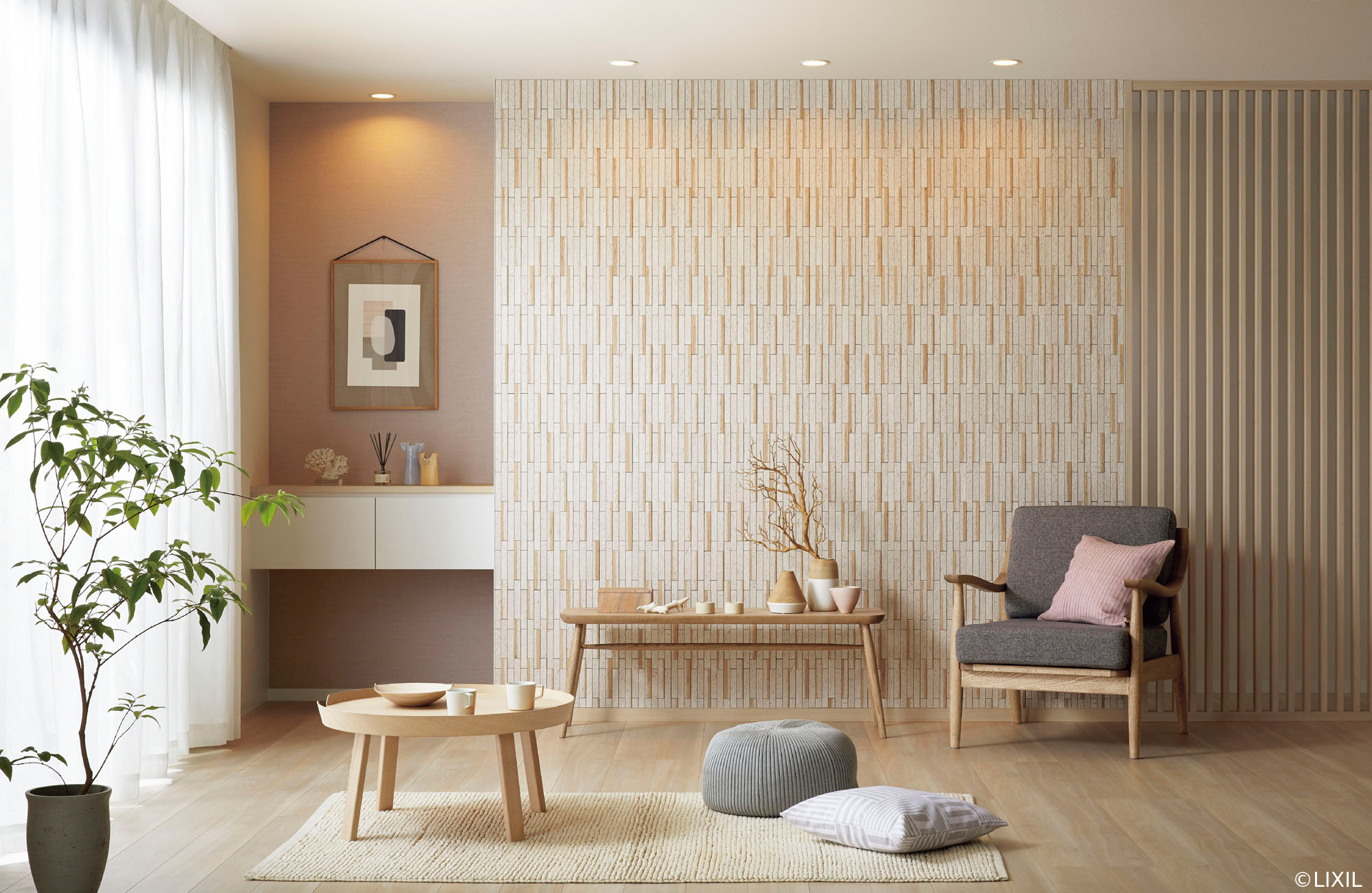 伝統的な和の素材である和紙の素朴で柔らかな質感と木目とを組み合わせ、アレンジしたデザインです。